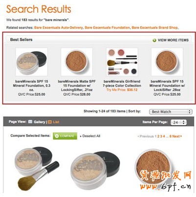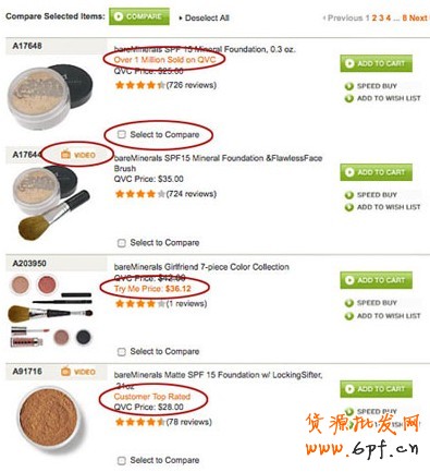 QVC化妝品站點,它搜索結果展示的亮點是視頻內容、對比工具、獨特的“Try Me Price”促銷價以及極具誘惑力的“Over 1 Million Sold”與“Custormer Favorite”導購信息。