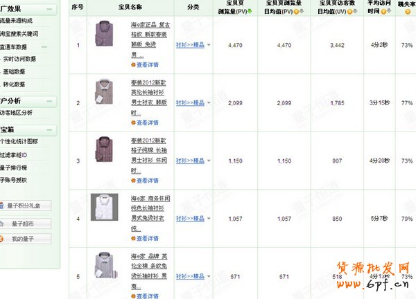 很多賣家確定店鋪的熱銷寶貝,基本都是靠“模仿”,今天流行豹紋小短裙,明天流行條紋小熱褲,但模仿的結果往往是別人賣爛的寶貝被重新搬上店鋪進行二次甩賣而已。在量子統計中,有一個“寶貝被訪排行”功能,功能里有三個數據須引起掌柜們的注意:寶貝訪客數(UV)丶平均訪問時間丶跳失率。這三項數據對發現潛力寶貝很有參考價值。