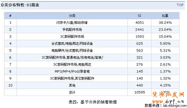 2.下面我們就分類,對該店鋪的商品和銷售進行具體分析。從,表三和圖一來看,該店鋪的店鋪總共有24個分類。從單品數量分布看,該店鋪82.93%的單品分布在前6個分類上,主次似乎不太分明,結構上有調整的空間。否則從商品運營和維護的角度來講,增加了額外的成本。而對比項目的SI分布圖,該店鋪82.21%的單品SI分布在前4個分類上,體現了主次分明的原則,單品分布結構較為合理。結合兩者的特點,該店鋪在商品分類和產品分布上可以做比較大的調整。