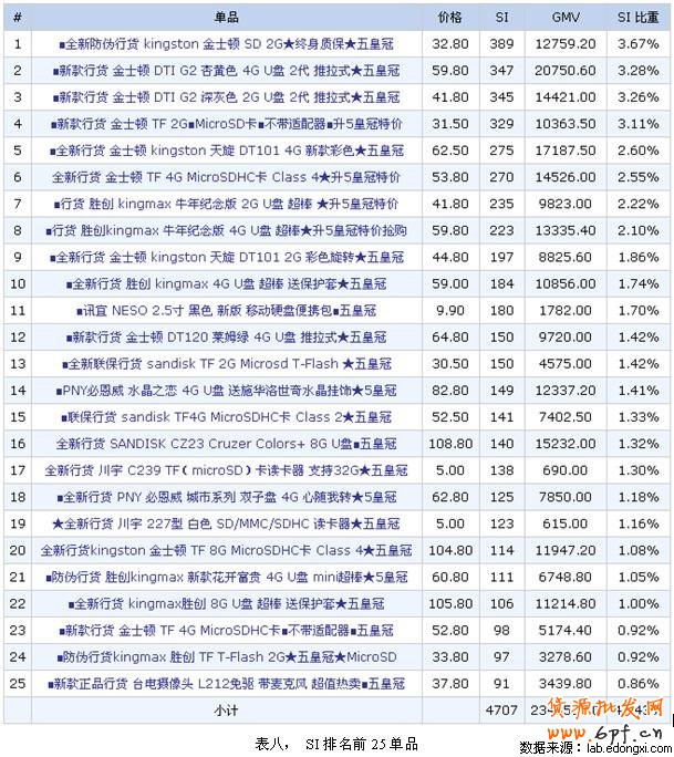 該店鋪SI排名前25的單品占總SI的44.43%。毫無疑問,這25件單品是該店鋪重點運營的產品,或者說可以重點運營的商品。從數據看,該店鋪的重點運營是成功的。五冠賣家的成功不在于他銷售商品的多少,而是基于銷售數據分析的不斷運營調整。從而達到最佳化的商品選擇和分類。