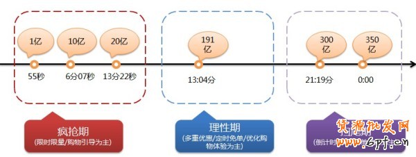 結合以上2013年大盤數據和2014年營銷亮點,從9月底和11月底近兩個月的時間,鉆展雙11營銷共分為以下五個節奏: