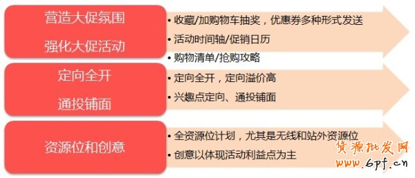 目的:雙11高潮期,通過前期用戶的蓄積,當天最主要就是刺激購買轉化,提升客單價,保持全天全時段流量持續高漲。定向溢價出到心里能承受價格,根據數據反饋及時調整。尤其是訪客定向、興趣點定向、DMP定向里的重點預熱期鉆展觸達過的客戶,包括鉆展展現過、點擊過的客戶,還有加收藏和購物車客戶,同事大流量資源位上要用通投來鋪面。如果未參加雙11會場,可提前引爆活動,用較低的成本獲取流量。