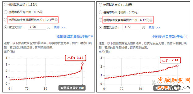 從上邊左圖可以看出PC端要出到3元左右才能在第一頁,而移動端只需要1.41元就可以出現在首屏,說明無線端的權重比PC端還要高,如果PC端質量得分是8分,那無線端估計是9分,10分了;右邊那個就相反了,PC端第一名只要2.14元,移動端展現在首屏需要6.12元,如果PC端是8分,估計移動端只有6分左右。