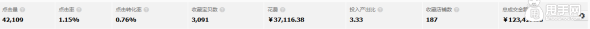 從圖中可看到,1個月的點擊量大概在2萬多,而平均每天點擊量不到1000,PPC在1塊錢左右,也就相當于是每天花費1K左右,ROI在1.11,點擊轉化率為0.32%,收藏成本為15.4元。