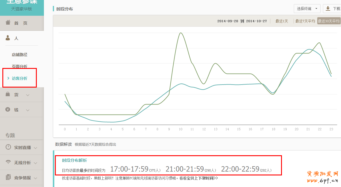 除了可以按照小時流量來分析找出一周7天每天的高峰時段,還可以參考生意參謀中的訪客分析數據,根據最近的30天、最近7天、昨天三種高峰時段的顯示來找出不同,同時也將直通車時段設置做好相應的調整,從而達到最佳的推廣效果,還可根據店鋪的實際情況來設置最佳的寶貝上下架時間。