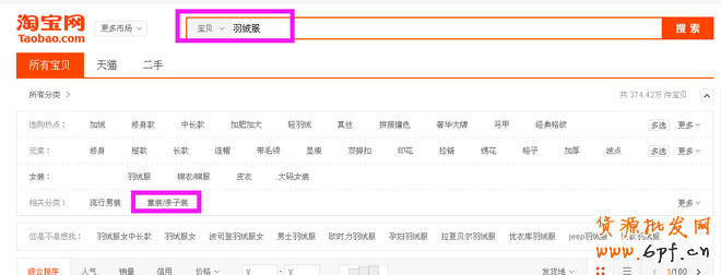 首先,搜索一級關鍵詞:羽絨服。