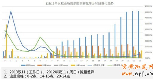 第二波的催付是針對已經在旺旺上進行了第一波催付但仍未付款的訂單。對于這些訂單,若我們人手不足,可以用催付短信進行二次催付。短信發放的時間如何安排?先來分析下去年的復盤數據就可以發現答案。(下圖:淘寶官方給出的女鞋類目會場商家雙11當天的成交分析(2013VS2012))