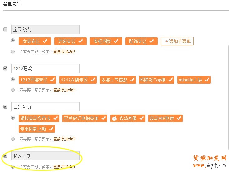 2、:只要在無線運營中心(http://wuxian.taobao.com/)-自定義菜單-勾選私人訂制就可以在無線店鋪首頁透出啦?。ㄗ⒁猓远x菜單最多只能選擇3個)