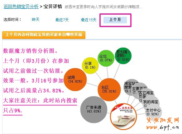 上面為數據魔方的寶貝銷售分析圖,今天是4月7日。魔方顯示上個月即是3月份,寶貝剛上架的時候做了一次鉆展。