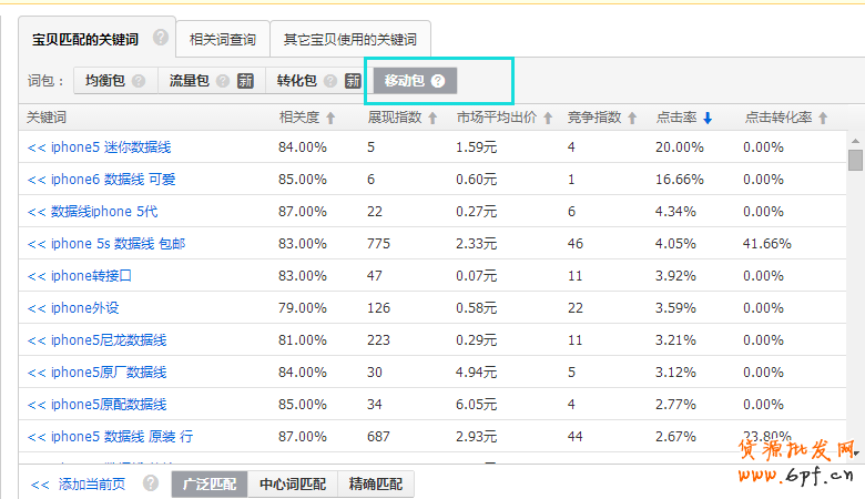在直通車后臺,添加寶貝推廣寶貝匹配關鍵詞中的“移動包”。前期建議選擇相關度及點擊率高的詞,保證前期有一個好的數據表現,提升關鍵詞質量分。