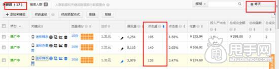 對于我的這個寶貝來說,點擊指數大概每天都有2000個左右就很不錯了,而且再多的我也沒那么多錢去燒(小賣家的硬傷——錢少),再按照這個方法去查詢之前所說的主推詞和輔推詞,我前期就加了4個詞,現在總共也就17個詞,所以能這些流量我覺得還不錯了。