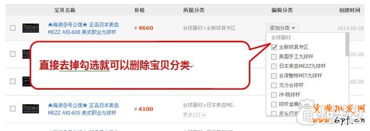5、刪除寶貝分類和添加寶貝分類的操作相同,只要找到需要分類的寶貝點擊添加分類,將需要刪除的分類去掉勾選即可,如: