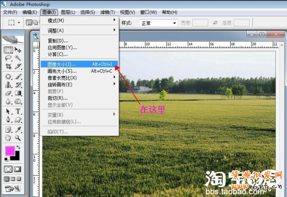 打開PS軟件,找開你的商品大圖,點擊菜單欄“圖像”→“圖像大小”如圖,