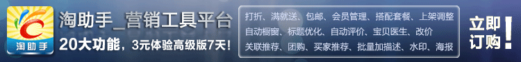 淘助手_賣家工具平臺,針對淘寶商品新的排名規則,在寶貝描述或店鋪首頁中安放各式各樣的推廣營銷模塊、店鋪公告通知等。比如寶貝關聯推薦 ;團購營銷推薦;寶貝活動主圖美化 個性設置寶貝logo、水??;店鋪活動一鍵發布海報、通知;買家口碑推薦、限時折扣等等16大功能。