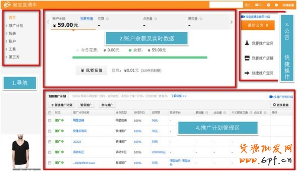首先您可以通過我的淘寶--我是賣家--營銷中心中選擇“我要推廣”點擊直通車圖標進入直通車操作系統。目前默認登錄為新版直通車操作系統.下面的圖為新版直通車操作平臺首頁,主要由:左側導航,中間賬戶余額和實時數據,右側公告快捷操作入口,以及下方推廣計劃管理區,
