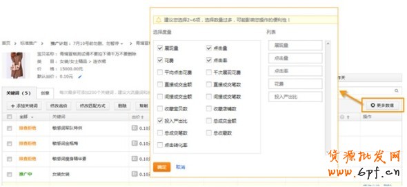 2)更多數據和恢復默認:點擊右上角“更多數據”按鈕,您可以自主選擇在推廣計劃管理區內顯示的數據度量。系統提供18個數據字段選擇,系統默認給展現量、點擊量、點擊率和花費。恢復默認便于快速回到系統提供的4個字段。