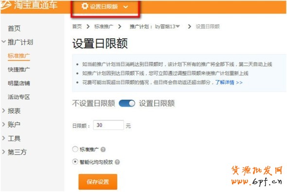 設置日限額的功能基本保持不變,您可通過滑動為推廣計劃設置每日扣費的最高限額,選擇“設置日限額“后,您可勾選標準投放或者智能化均勻投放。