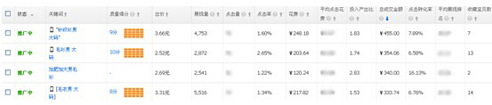 由于我推廣的是整體,基本上都是零銷量的店鋪產品,所以在加詞的時候,是從長尾詞開始加的,然后是中性詞,泛詞我先不加,但如果一定要加的話可以先出低價,或者精準匹配之后再低價,主要還是看關鍵詞的點擊率,另外,加的詞一定要考慮整體的情況,例如男裝,長尾詞可以精準引流,但是男裝的長尾詞出價明顯偏高,而且長尾詞的展現量比較小,如果整體點擊情況不好的話,就會導致質量分下降,使得展現量就更少了,這樣的話,即是出再高的價格也很難獲取到流量。