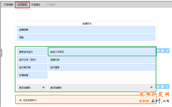 點擊“裝修”的“布局管理”(紅框),然后在“綠色框”內的內容可以隨意拖動調換位置,另外“自定義內容”(綠框)區域和“添加布局單元”(橙色框)可以根據需要選擇添加。