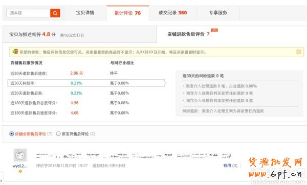 2. 賣家店鋪退款售后評價,展示賣家近180天的情況: