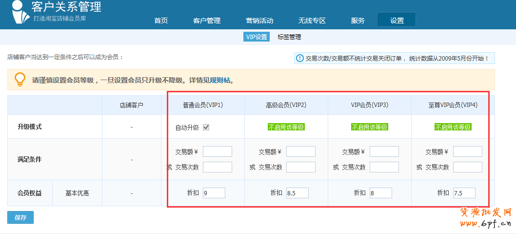 通過在會員關系管理后臺的設置中,可以把買家設置分為:普通會員、高級會員、vip會員、至尊vip會員,通過交易金額和交易筆數設置不同等級買家,從而加強買家購物榮譽感和粘性。比如,普通會員需要在店鋪購買過一次產品,成為普通會員,可以享受普通會員的折扣價格等。通過這種方式,帶動老客戶加入會員的行列,并為了享受更多的特權而提升自己的等級。