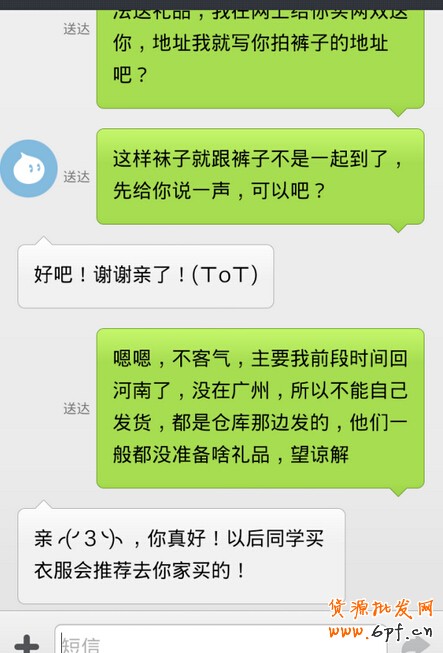 之前我就遇到過一個客戶,來到店里開始聊天,就說喜歡我的寶貝,問我可不可以送他一雙襪子,因為他沒襪子穿了,由于我也是做代理的,倉庫那邊是沒有小禮品這類的東西贈送的,所以很無奈,但是卻又不想失去這來自不易的生意,于是我跟客戶說沒有禮品的,能不能少您幾塊錢,但是這個客戶就是不肯答應,非要一雙襪子,不用少錢,說完就下單了,沒辦法,我只有對客戶說好的,一定給您送,當時我也很無奈,就去跟倉庫那邊說好話,讓他們幫忙買雙襪子,倉庫那邊說沒時間太忙,無奈之下,我就去淘寶買兩雙送給客戶,但是不知道該怎么跟客戶解釋,最終還是硬著頭皮給客戶發短信(因為客戶旺旺已經下線了),大家可看下圖:
