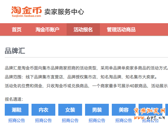 針對店鋪綜合實力強的賣家,金幣各類目提供若干個品牌坑位供報名。報名的單店可有一個品牌匯入口及單獨的活動頁面供店鋪商品展示,品牌匯入口在淘金幣首頁及類目頻道/會場首頁享受置頂