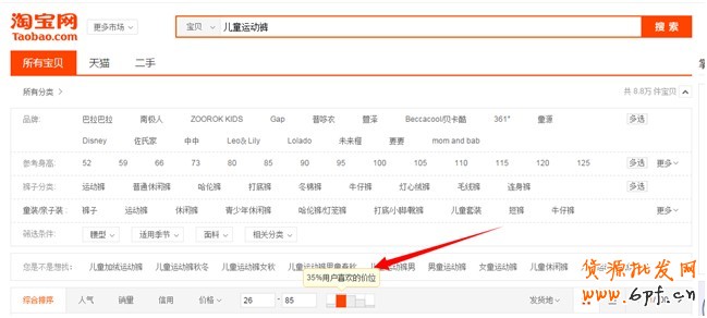 另外,在搜索兒童運動褲的人群中,35%的用戶喜歡26-85這個價格區間的寶貝,說明這個價格區間的市場潛力還是比較大的!所以店鋪也定位在這個價格區間,定價為49元。