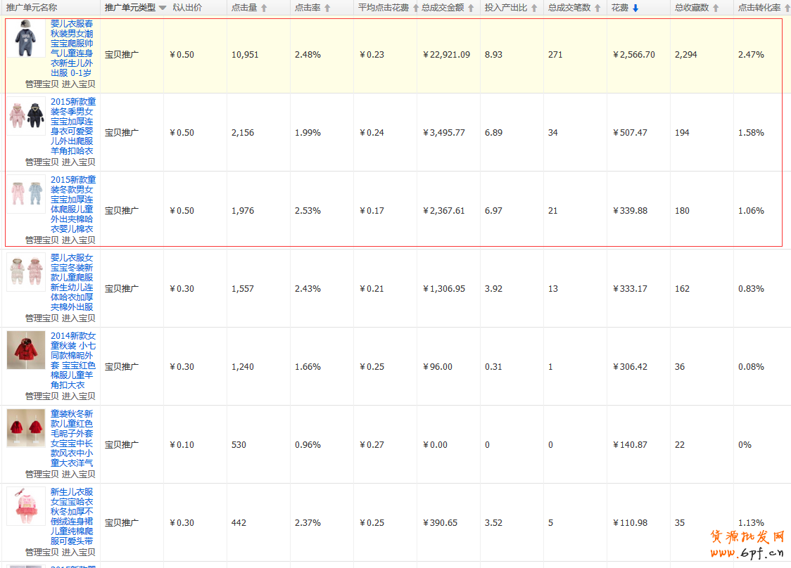 從上面的圖中的產品中,我們可看到紅框里面的三款寶貝,流量是比較大的,并且點擊率也是比較高的而ppc方面也是相對比較低,而轉化率卻遠遠高于其它產品,從成交筆數上來看,也是比較高的,并且ROI也是在眾多寶貝中脫穎而出,所以根據上述3個維度分析,這三款寶貝經過測試分析之后,可以成為賬戶里面的主推寶貝。