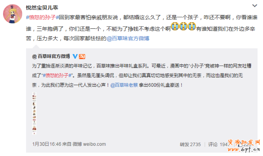 同時,百草味向網友豪贈600份年味禮盒,作為對“這一代人”的致意,希望他們可以放下擔子,過個好年;也呼吁所有人,多為對方考慮,讓每一個人都能享受一個舒心的春節。