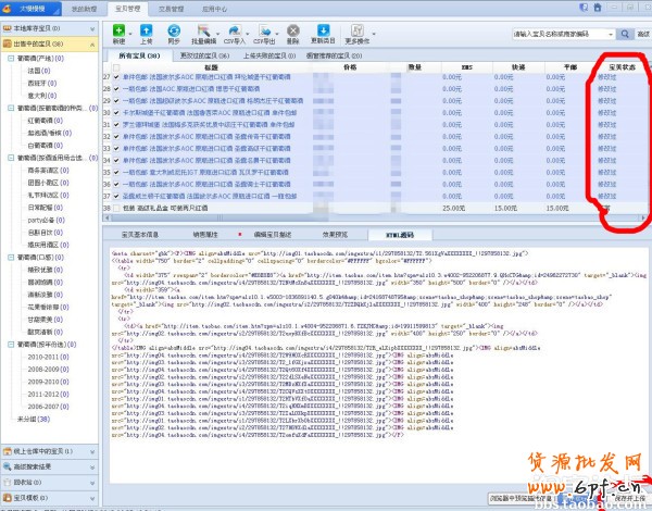 登錄淘寶助理,選擇你想要編輯的寶貝(在寶貝前面勾選),然后選擇批量編輯寶貝描述,再點擊HTML源碼按鈕。選擇下圖中藍色區域的代碼(就是兩個table之間的代碼),然后復制下來。