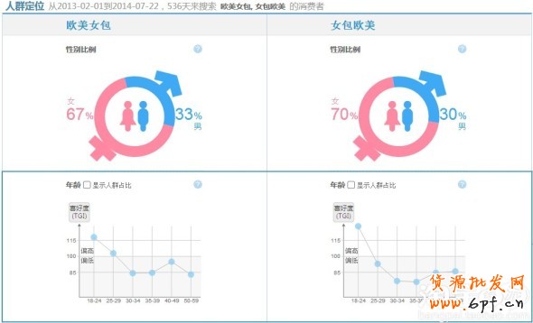 淘寶上購買歐美女包的群體主要是18—24歲的年輕女性。上圖可以看出年齡段也是從18-30歲不等。這部分人群也是網購的中堅力量。 并且經過市場調研分析,喜歡歐美女包風格的這一類人群大部分是白領,這類女性是有一定的經濟基礎的。
