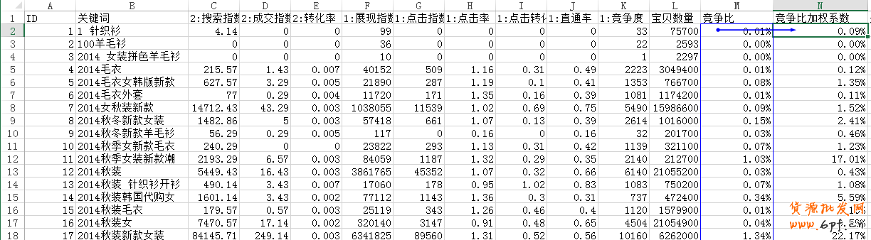 算出競爭比,競爭比=搜索指數/寶貝數量
