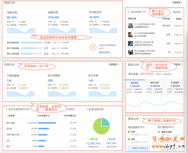 店鋪實時數據、商品實時排行、店鋪行業排名、店鋪經營概況、流量分析(流量構成、PC端與無線端的流量來源、入店關鍵詞)、商品分析、交易分析、服務分析、營銷分析、市場行情,為你展示店鋪經營全鏈路360度無死角的核心數據分析!