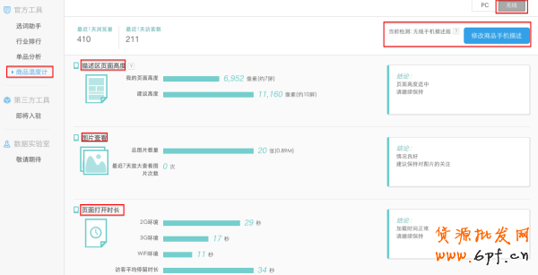 4、在無線端支持查看商品的最近1天瀏覽量和訪客數。對于單寶貝在無線端,由描述頁面高度、圖片查看、頁面打開時長三個方面進行診斷寶貝在無線端的問題,讓你更好了解寶貝在無線端出現的問題,提供優化建議重點打造無線潛力寶貝。