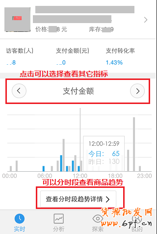 (1)分時段實時展現該商品當日的支付金額、訪客數、瀏覽量和支付買家數,讓您能實時關注每個時段的數據變化;