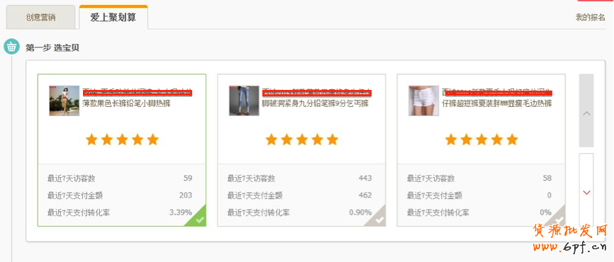 1)選寶貝:系統給出報名上聚劃算成功概率最高的6個商品,按聚劃算指數從高到低排序,由用戶結合自身情況來決定選擇報名的具體寶貝。