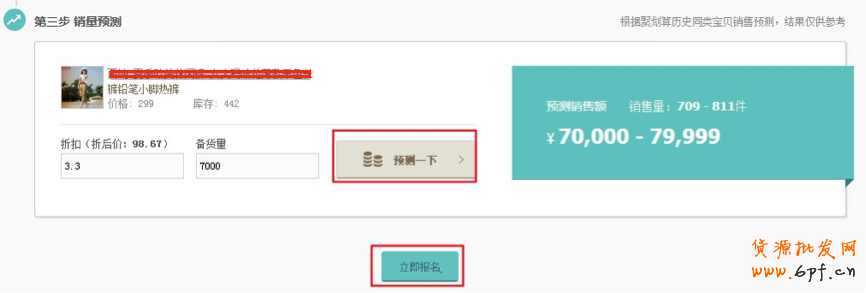 3)銷量預測:結合定價參考及自身備貨情況,輸入不同的折扣以及備貨量,進行聚劃算預測,若比較滿意則直接點擊立即報名,進入聚劃算報名通道,若不滿意則可調整選品再重新來過。