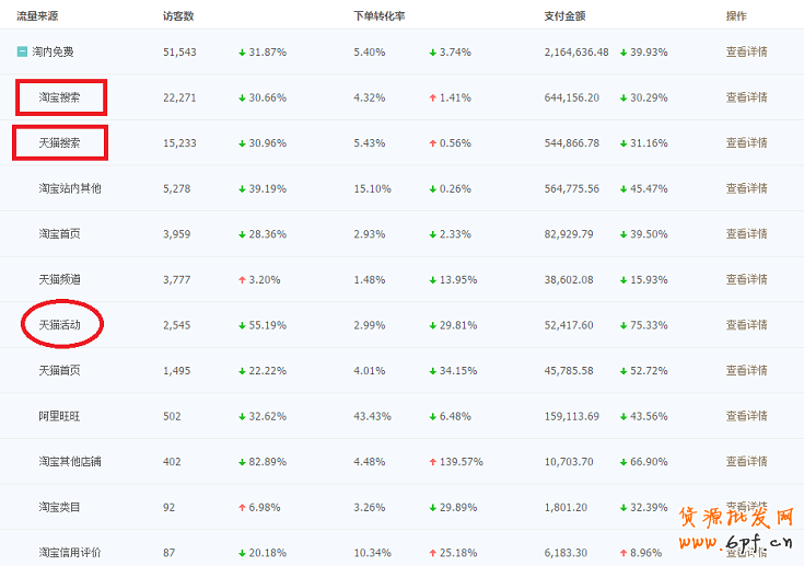 流量來源主要分為了6個版塊:淘內免費、自主訪問、淘外流量、付費流量、其它。