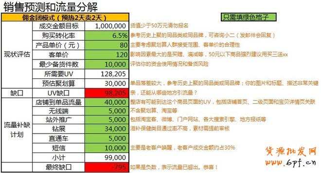 如上圖所示,根據成交目標、轉化率和客單價算出所需UV,下面的綠色部分就是流量補缺計劃,從這里我們可以得出,鉆展所需的流量為34000,如果排除有些錯誤點擊多 話,那么鉆展點擊數可以視為35000,根據公式:預算=點擊數*點擊成本