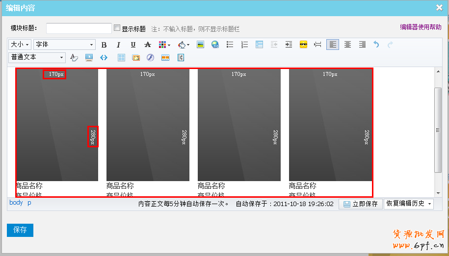 這里僅僅是自定義內容區的編輯樣式,用戶可以直接使用預設好像素尺寸的圖片模版來進行商品圖片編輯和促銷模塊編輯。根據預先標記了的長寬尺寸,進行圖片制作,再將制作好的圖片插入到具體對應的區域,即可完成單個商品或者整個促銷區的編輯操作。