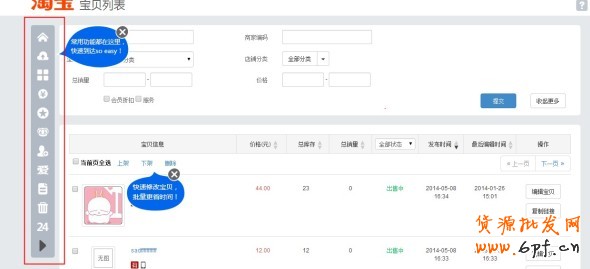 近期淘寶網將推出新版的賣家寶貝管理應用(即原有的出售中、倉庫里和櫥窗推薦三個功能)。新版鏈接:http://sell.taobao.com/auction/commodity/index.htm。