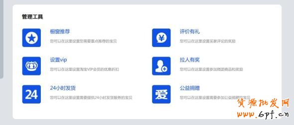 原有的櫥窗推薦、VIP設置、愛心捐贈、回收站、歷史寶貝、評價有禮、拉人有獎、24小時發貨、體檢中心等功能現在全部作為單獨的功能組件提供服務,可以在寶貝管理首頁找到入口。