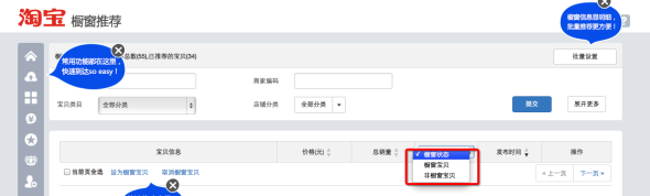 櫥窗設置的功能在櫥窗推薦頁面中的頂部,功能名稱改為了批量設置。