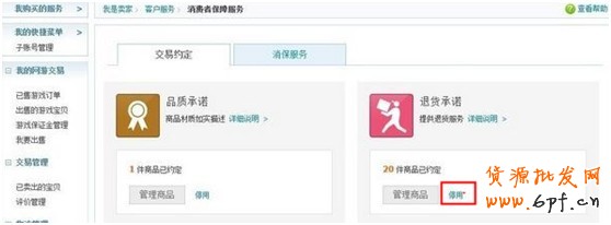 B單個商品停用,進入賣家中心“消費者保障”中“交易約定”在商品管理界面,選中要停用的商品選擇“未約定”即停用。