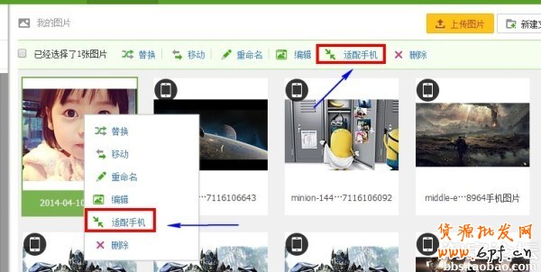 可以看到您剛才成功上傳的圖片。如果您想將這張圖片適用到手機,可以點擊右上角或者右鍵選擇圖片“適配手機”按鈕。