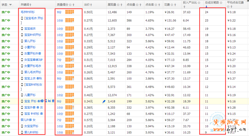 截取部分寶貝的銷售情況,目前寶貝整體銷量都上來了,且有幾款相對比較熱銷,寶貝推廣也形成了一定的梯隊,整體的發展比較良好。