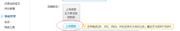 3.店鋪標志。店標代表著你店鋪的象征,店標圖片可以設置是你的產品或者是店鋪名字,最重要是讓人記住你的店,文件的格式也有要求的,要按要求上傳。(如下圖)