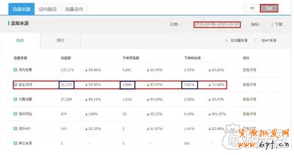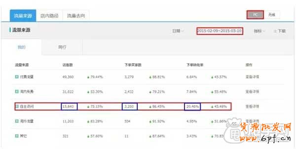 綜上兩圖顯示了店鋪整月所有的流量來源構成情況。無論是PC端還是無線端,自主訪問的轉化率都是最高的。這是因為通過收藏夾、購物車等進來的買家屬于二次訪問,其對于本店鋪商品有較強的購買粘性,具有很強的針對性,所以其轉化率比其他來源的買家要高,帶來的下單數也會很高。