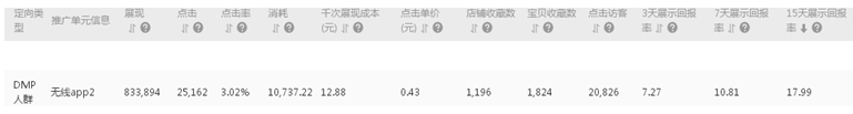 從以上數據可以看出,這個位置DMP定向點擊率高,cpc較低,收藏率高,最主要回報率比較高,最近30天15天回報率可以達到17左右。